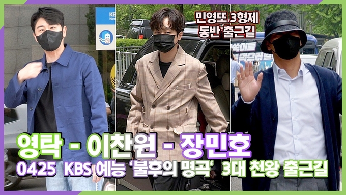 [뉴스인스타 양철수기자] 4월25일(월) 오전, 서울시 영등포구 여의도 KBS 공개홀에서 진행되는 KBS 예능 '불후의 명곡' 어버이날 특집 3대 천왕 녹화를 위해 영탁, 이찬원, 장민호가 방송국에 도착하고 있다.