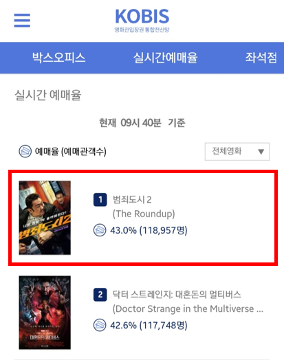 대한민국 대표 범죄액션 시리즈 <범죄도시2>가 5월 18일(수) 개봉을 앞두고 <닥터 스트레인지: 대혼돈의 멀티버스>를 제치고 전체 예매율 1위에 등극했다.