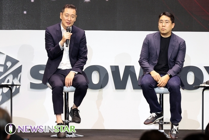 [뉴스인스타 양철수기자] 6월15일(수) 오전, 서울시 용산구 서울드래곤시티 그랜드 볼룸 백두에서 쇼박스(SHOWBOX)의 새로운 기업 비전과 전략을 공개하는 미디어데이 행사가 열려 쇼박스 김도수대표와 MCG(Maum Capital Group) 구본웅 의장이 기자와 질의 응답 시간을 갖고 있다.