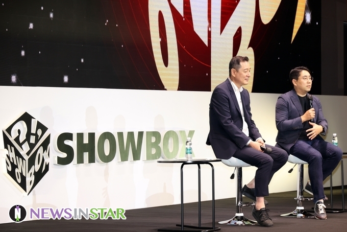 [뉴스인스타 양철수기자] 6월15일(수) 오전, 서울시 용산구 서울드래곤시티 그랜드 볼룸 백두에서 쇼박스(SHOWBOX)의 새로운 기업 비전과 전략을 공개하는 미디어데이 행사가 열려 쇼박스 김도수대표와 MCG(Maum Capital Group) 구본웅 의장이 기자와 질의 응답 시간을 갖고 있다.