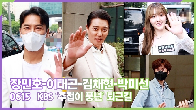 [뉴스인스타 양철수기자] 6월 15일(수) 오후, 서울시 영등포구 여의도 KBS에서 진행된 KBS 예능 '주접이 풍년' 출연을 마치고 MC 장민호, 이태곤, 박미선과 '남진' 주접단 케플러 김채현이 방송국을 나서고 있다.