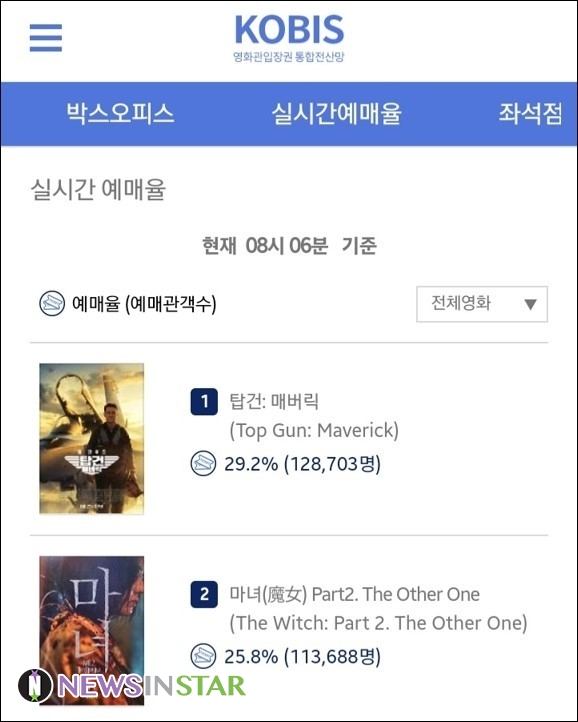올 여름 글로벌을 강타한 최고의 흥행 신드롬 영화 <탑건: 매버릭 >(수입/배급: 롯데엔터테인먼트)이 영진위 통합전산망 6월 19일(일) 오전 8시 기준, <마녀2>를 제치고 전체 예매율 1위에 등극 및 사전 예매량은 12만 8천 장을 돌파했다.
