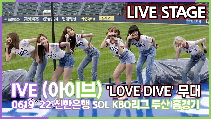 [뉴스인스타 양철수기자] 6월19일(일) 오후, 서울시 송파구 잠실동 잠실야구장에서 진행되는 2022 ‘신한은행 SOL KBO리그’ 두산 홈경기에서 그룹 IVE(아이브) 안유진, 장원영, 가을, 레이, 리즈, 이서가 두산베어스 vs kt위즈 경기 클리닝타임에 특별공연으로 '러브 다이브' 무대를 선보이고 있다.