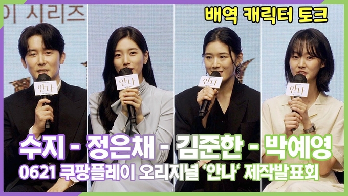 [뉴스인스타 양철수기자] 6월 21일(화) 오전, 서울시 영등포구 여의도 콘레드 서울에서 진행된 쿠팡플레이 오리지널 '안나' 제작발표회가 열려 배우 수지, 정은채, 김준한, 박예영이 참석해 배역 캐릭터에 대해 설명하고 있다.