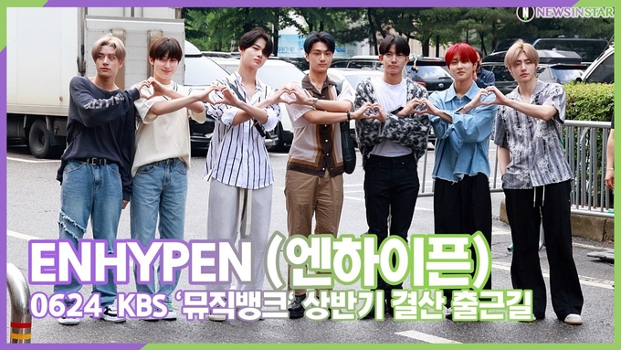 [뉴스인스타 양철수기자] 6월24일(금) 오후, 서울시 영등포구 여의도 KBS 신관 공개홀에서 생방송으로 진행되는 KBS '뮤직뱅크' 상반기 결산 출연을 위해 그룹 ENHYPEN(엔하이픈) 정원, 희승, 제이, 제이크, 성훈, 선우, 니키가 방송국에 도착해 포즈를 취하고 있다.