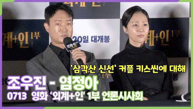 [뉴스인스타 양철수기자] 7월 13일(수) 오후, 서울시 용산구 CGV 용산아이파크몰에서 영화 ‘외계+인 1부’ 언론시사회가 열려 배우 염정아, 조우진 삼각산 도사가 키스씬에 대해 이야기하고 있다.