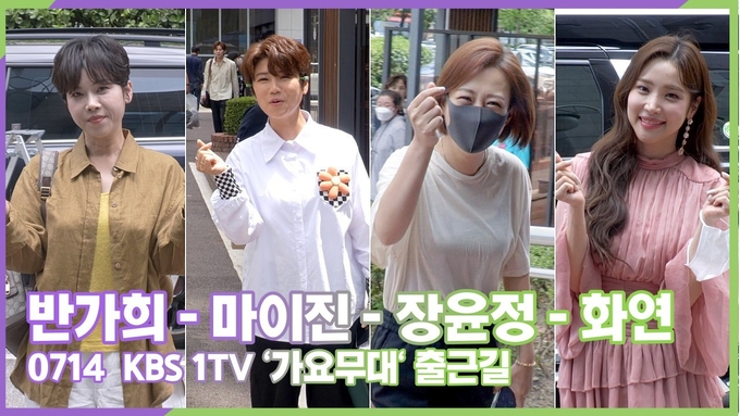 [트롯인스타 양철수기자] 7월 14일(목) 오후, 서울시 영등포구 여의도동 KBS 홀에서 진행되는 KBS 1TV '가요무대' 녹화를 위해 가수 장윤정, 마이진, 반가희, 화연이 방송국에 도착해 포즈를 취하고 있다.