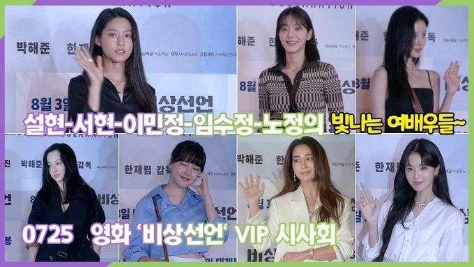 [뉴스인스타 양철수기자] 7월25일(월) 오후, 서울시 강남구 삼성동 메가박스 코엑스에서 진행되는 영화 '비상선언' VIP 시사회에 셀럽 설인아, 이열음, 노정의, 설현, 안소희, 임나영, 서현, 이민정, 임수정이 참석해 포토타임을 갖고 있다.
