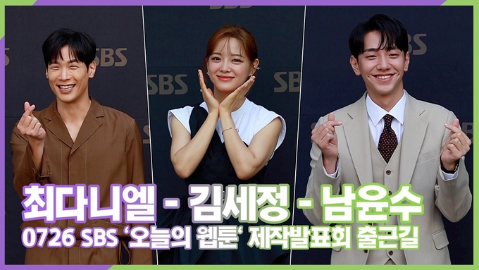 [뉴스인스타 양철수기자] 7월26일(화) 오전, 서울시 양천구 목동 SBS방송센터에서 진행되는 SBS 새 금토드라마 '오늘의 웹툰' 제작발표회에 참석하기 위해 최다니엘, 김세정, 남윤수가 방송국에 도착해 포즈를 취하고 있다.