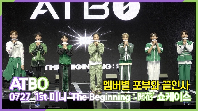 [케이팝인스타 양철수기자] 7월 27일(수) 오후, 서울시 서대문구 신촌동 연세대학교 100주년 기념관에서 그룹 에이티비오(ATBO) 1st 미니 'The Beginning : 開花' 발매기념 쇼케이스가 열려 오준석, 류준민, 배현준, 석락원, 정승환, 김연규, 원빈이 참석해 끝인사를 하고 있다.