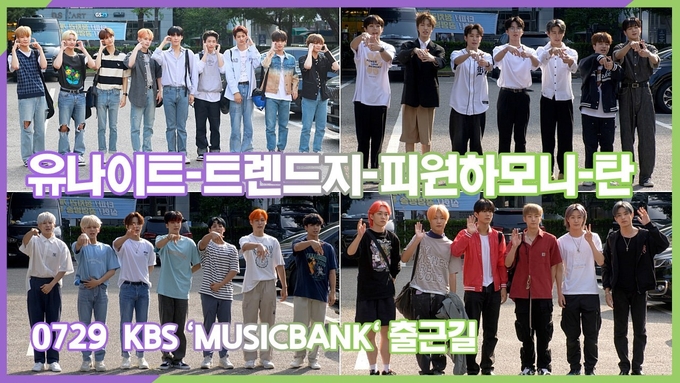 [케이팝인스타 양철수기자] 7월 29일(금) 오후, 서울시 영등포구 여의도 KBS 신관 공개홀에서 진행되는 KBS ‘뮤직뱅크’ 생방송 출연을 위해 그룹 탄(TAN), 유나이트(YOUNITE), 피원하모니(P1Harmony), 트렌드지(TRENDZ)가 방송국에 도착해 포즈를 취하고 있다.