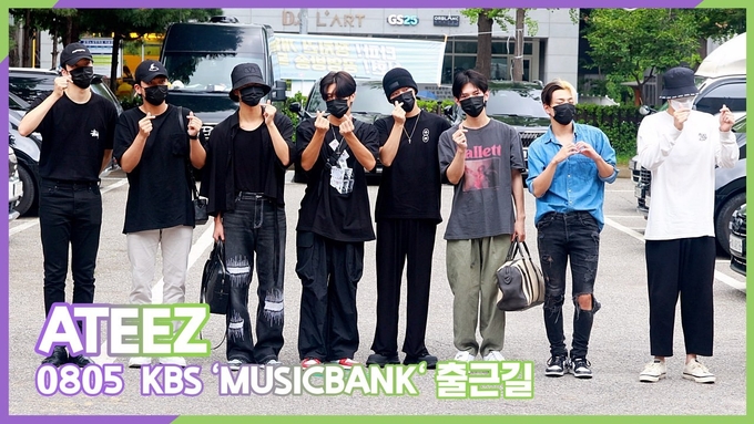 [케이팝인스타 양철수기자] 8월 5일(금) 오전, 서울시 영등포구 여의도 KBS 신관 공개홀에서 열린 KBS '뮤직뱅크' 생방송에 참석하기 위해 그룹 에이티즈(ATEEZ) 홍중, 성화, 윤호, 여상, 산, 민기, 우영, 종호가 방송국에 도착해 포즈를 취하고 있다.