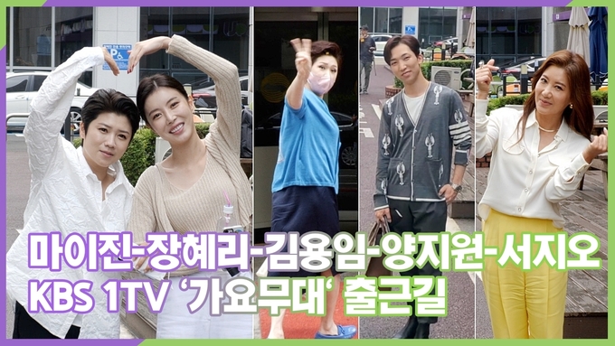 [트롯인스타 양철수기자] 8월 11일(목) 오후, 서울시 영등포구 여의도 KBS 홀에서 진행되는 KBS 1TV ‘가요무대' 녹화를 위해 트롯 가수 양지원, 마이진, 장혜리, 서지오, 김용임이 방송국에 도착해 포즈를 취하고 있다.