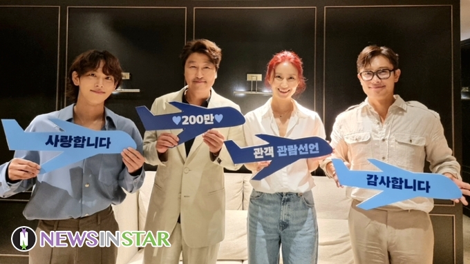 올여름 극장가 활기를 모으고 있는 영화 <비상선언>이 영진위 통합전산망 기준 개봉 18일째인 8월 20일(토) 200만 관객을 돌파했다. 영화 <비상선언>은 200만 관객 돌파와 함께 올여름 극장가 한국 영화 기대작들의 흥행 릴레이를 이어나가고 있다. 다채로운 장르와 각각의 매력을 가진 한국 영화들이 올여름 무더위와 폭우를 피하는 관객들을 극장가로 이끌고 있는 것. 이에 감사의 의미로 배우들의 200만 관객 돌파 감사 인증 사진을 공개했다. 송강호, 이병헌, 임시완, 김소진이 “사랑합니다, 200만 관객 관람선언, 감사합니다”라며 함께 인사를 전했다.