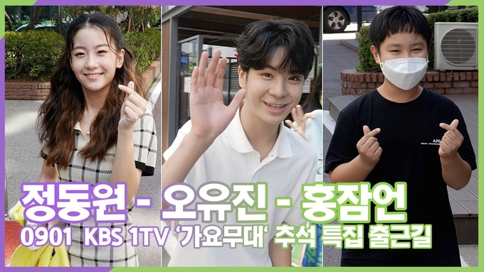 [트롯인스타 양철수기자] 9월 1일(목) 오후, 서울시 영등포구 여의도동 KBS 홀에서 진행되는 KBS 1TV '가요무대' 추석 특집 녹화를 위해 미스터트롯 정동원, 홍잠언, 전국트롯체전 오유진이 방송국에 도착하고 있다.