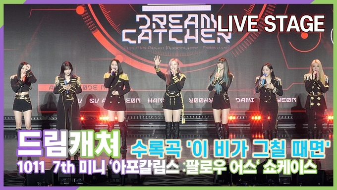 [케이팝인스타 양철수기자] 10월 11일(화) 오후, 서울시 광진구 건국대학교 새천년 대공연장에서 그룹 드림캐쳐(DREAMCATCHER)의 일곱 번째 미니앨범 '아포칼립스 : 팔로우 어스(Apocalypse : Follow us)' 발매기념 미디어 쇼케이스가 열려 지유, 수아, 시연, 유현, 다미, 한동, 가현이 수록곡 '이 비가 그칠 때면' 무대를 선보이고 있다.