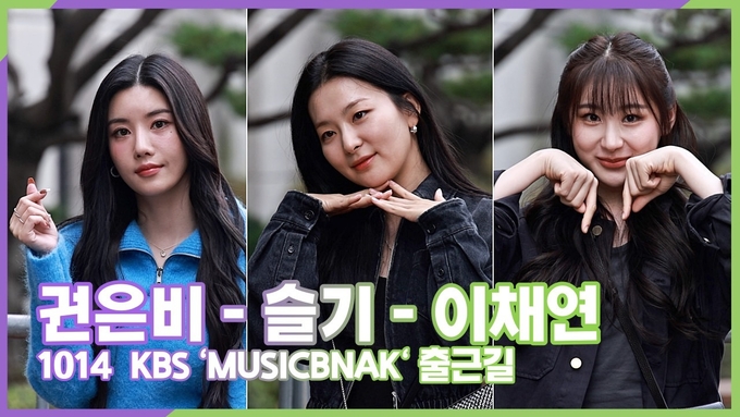 [뉴스인스타 양철수기자] 10월 14일(금) 오전, 서울시 영등포구 여의도 KBS 신관 공개홀에서 진행되는 KBS '뮤직뱅크' 출연을 위해 솔로가수 슬기(레드벨벳), 권은비, 이채연이 방송국에 도착해 포토타임을 갖고 있다.