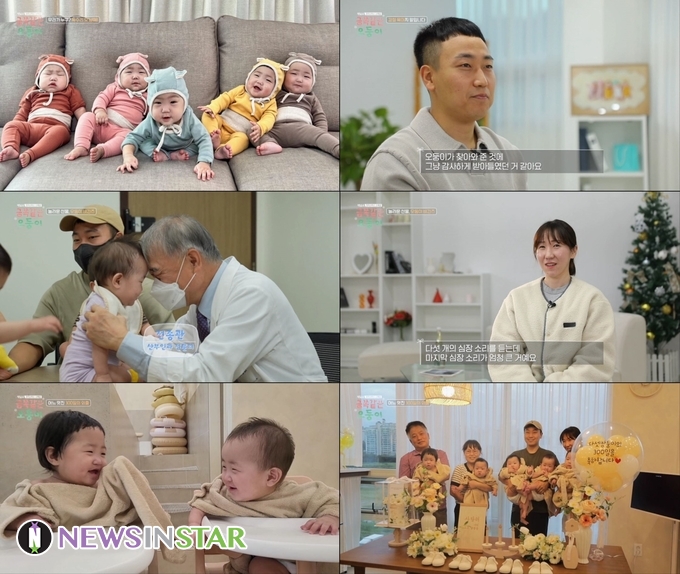 한편, 눈에 넣어도 안 아플 정도로 사랑스러운 오둥이지만 육아 현장은 전쟁과 같은데. 김진수, 서혜정 씨 부부 둘이서만 다섯 명의 아이들을 육아하는 것은 불가능, 김진수 씨의 부모님까지 오둥이 돌보기에 전격 투입하게 된다. 하지만, 하루 쓰는 기저귀 개수 약 50개, 하루 먹는 분유량 1통(759g 기준), 하루 수십 번의 씻기기와 다섯 번의 정식 목욕은 물론, 번갈아 가며 잠들고 깨는 아이들 때문에 날마다 벌어지는 재우기 전쟁에 제대로 침대에 누워 잘 수도, 식탁에 앉아서 밥을 먹을 여유도 없는 상상 초월 강철육아가 펼쳐진다는데. 하루도 조용한 날 없는, 하지만 웃음과 감동이 끊이지 않는 육아의 현장은 오늘 방송에서 확인할 수 있다.