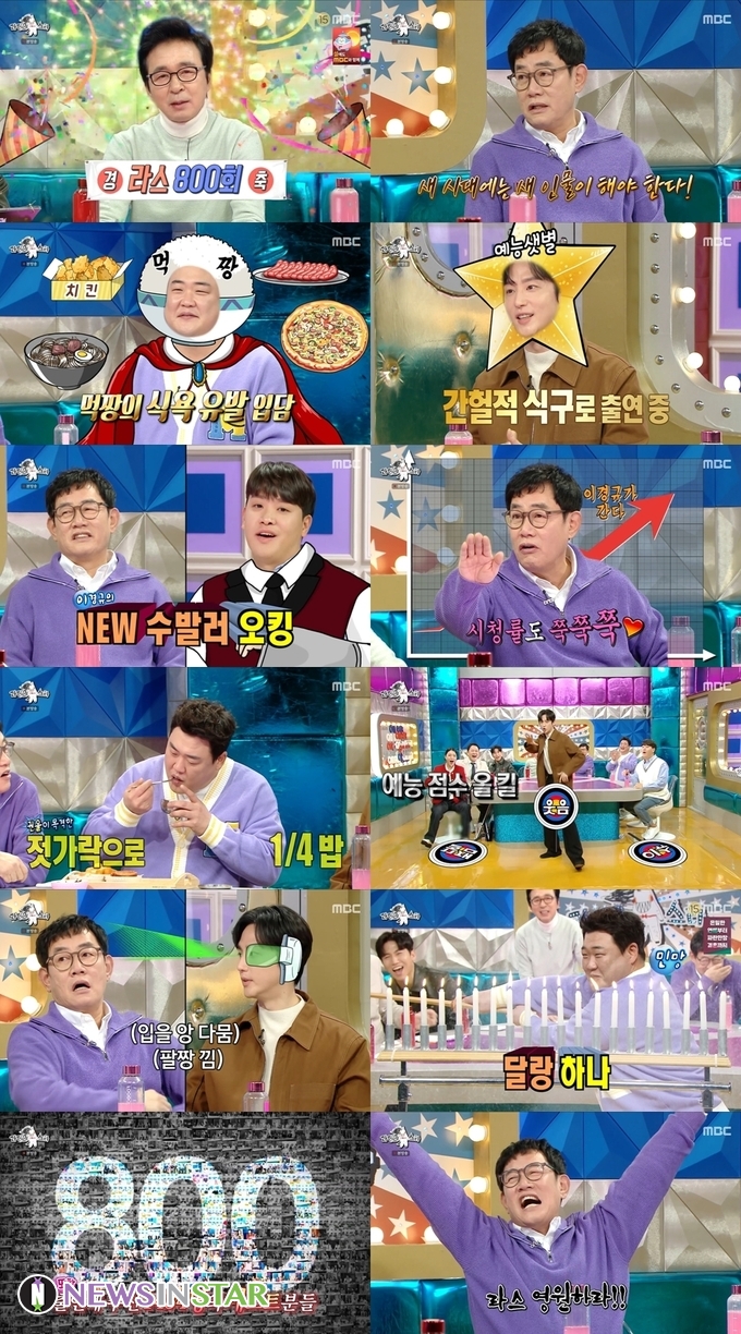 ‘라스’ 800회 축하의 대미를 장식한 건 김준현의 목검으로 촛불 끄기. 검도 선수 출신인 김준현은 ‘라스’ 대표 레전드 짤로 회자되는 김국진의 ‘양초 박살 짤’에 시도해보겠다고 호기롭게 도전했으나 두 번 연속 촛불 하나만 끄는 굴욕을 맛봐 폭소케 했다. 여기에 이경규는 ‘라스’를 향한 덕담을 전하던 중 “900회쯤 내가 합류했으면 좋겠다”라고 속마음을 솔직하게 털어놔 웃음을 더했다.
