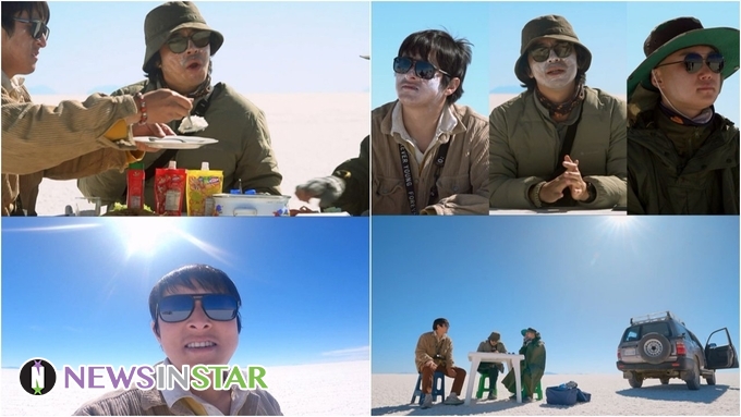 공개된 사진 속에는 기안84, 이시언, 빠니보틀이 온통 하얀색으로 뒤덮인 ‘우유니 소금 사막’ 한복판에서 하얀 분칠(?)을 한 모습이 담겨 폭소를 자아낸다. 세 사람은 그림 같은 풍경에 휩싸여 꿈 같은 점심 만찬을 즐긴다.