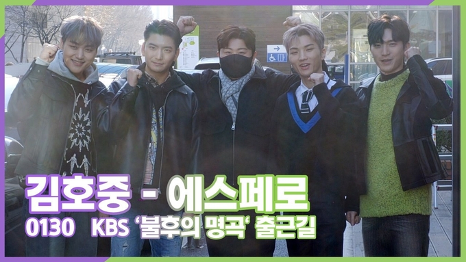[뉴스인스타 양철수기자] 1월30일(월) 오전, 서울시 영등포구 여의도 KBS 신관 공개홀에서 진행된 KBS '불후의 명곡' 출연을 위해 트바로티 김호중과 크로스오버그룹 에스페로 허천수, 남형근, 켄지, 임현진이 방송국에 도착해 포즈를 취하고 있다..
