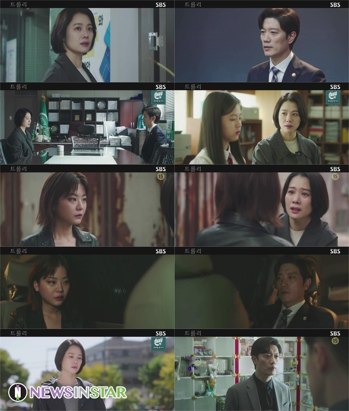 지난 31일 방송된 SBS 월화드라마 ‘트롤리’(연출 김문교, 극본 류보리, 제작 스튜디오S) 12회에서는 아들 남지훈(정택현 분)이 생전 성폭행을 했다는 사실을 접한 김혜주(김현주 분), 남중도(박희순 분)가 혼란과 갈등에 휩싸였다. 남중도는 김수빈(정수빈 분)이 찾아와 협박했다고 주장했고, 김혜주는 되려 그의 진심을 의심했다. 하지만 여기에도 반전은 있었다. 남중도와 김수빈이 기자회견 전 나눈 거래에 이어, 남지훈의 사망 당일 숨겨져 있던 비밀이 공개된 것.