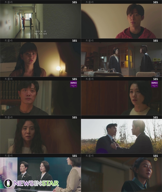 지난 7일 방송된 SBS 월화드라마 ‘트롤리’(연출 김문교, 극본 류보리, 제작 스튜디오S) 14회에서는 김혜주(김현주 분), 남중도(박희순 분)의 아들 남지훈(정택현 분)의 사고 당일 이야기가 그려졌다. 그날 남지훈과 집을 찾았던 김수빈(정수빈 분)은 남중도와 현여진(서정연 분)의 불륜 관계를 확신했고, 그 사실을 폭로하겠다고 했던 남지훈이 스스로 목숨을 끊었을 리 없다며 타살 가능성을 주장했다.