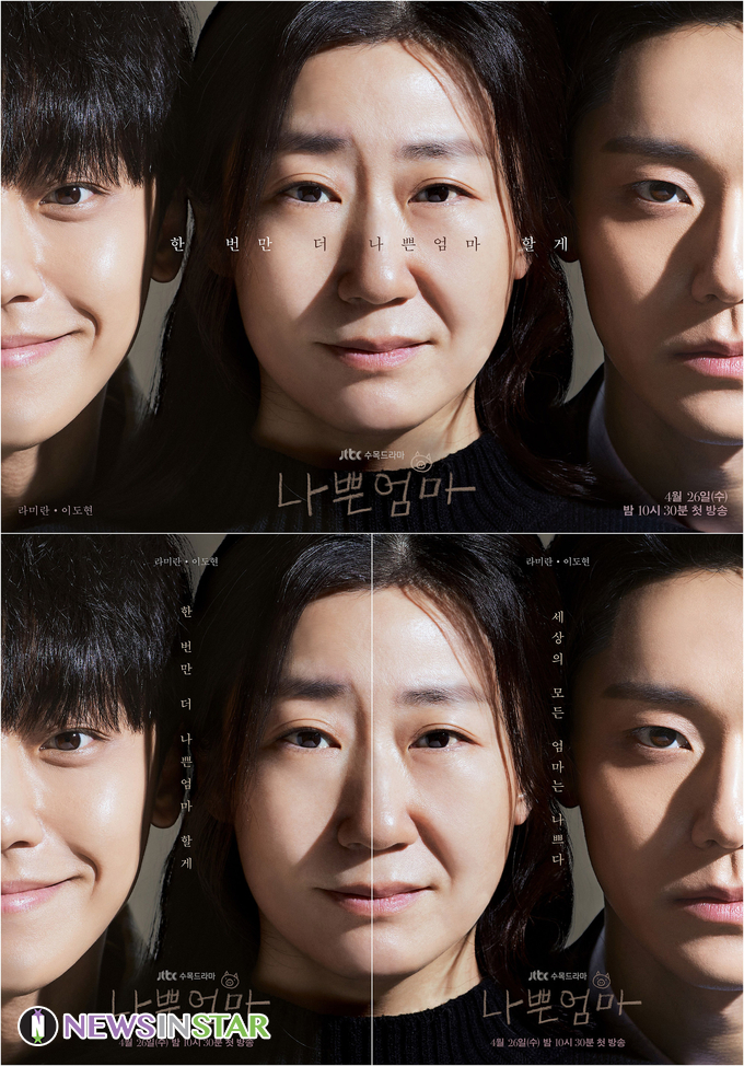오는 4월 26일(수) 첫 방송되는 JTBC 새 수목드라마 ‘나쁜엄마’(연출 심나연, 극본 배세영, 제작 드라마하우스스튜디오∙SLL∙필름몬스터) 측은 24일, 영순(라미란 분)과 강호(이도현 분) 모자(母子)의 ‘인생 리부트’를 알리는 메인 포스터 3종을 공개했다.