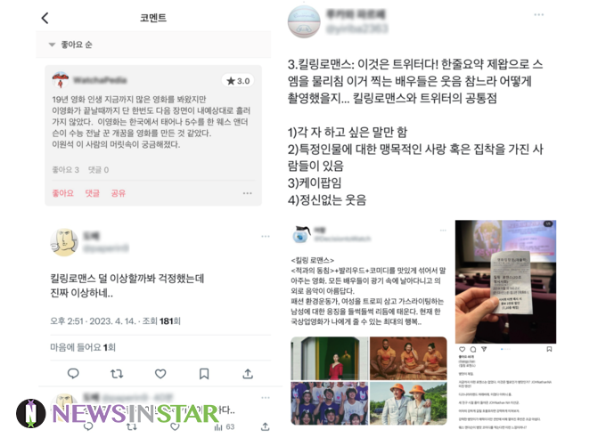 개봉과 동시에 Z세대 취향을 완벽하게 저격한 영화 <킬링 로맨스>의 관객 리뷰가 화제다. 이미 저 세상 텐션 코미디 영화로 언론사 반응 또한 기존 리뷰들에서는 볼 수 없었던 문장들로 채워졌던 <킬링 로맨스>는 관객들에게도 특별한 경험을 제공하고 있는 것으로 보인다. 이례적으로 금요일에 개봉하여 한국 영화 박스오피스 1위에 등극한 <킬링 로맨스>는 개봉 후 트위터, 인스타그램 등 소셜 미디어 및 각종 연예 게시판의 뜨거운 감자로 떠올랐다. 영화를 관람한 관객들은 <킬링 로맨스>에 대한 신박한 후기들을 올리고 있으며, 이 글들이 인기 게시글이 되어 뜨거운 반응을 얻고 있다.