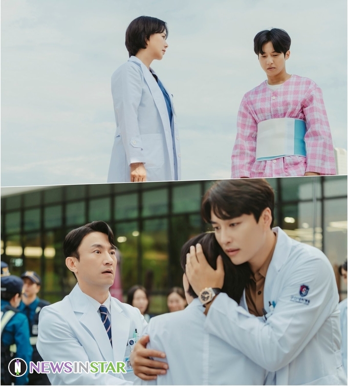 그런 가운데 어딘가를 바라보는 서인호, 로이킴의 놀란 얼굴이 눈길을 끈다. 두 남자의 걱정 어린 시선 끝에는 환자와 옥상 난간에 서 있는 차정숙이 있다. 위태로운 광경에 떠들썩해진 주변 분위기와 달리 환자를 달래는 차정숙의 얼굴은 흔들림 없이 차분하다.