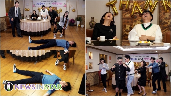 공개된 사진 속 재롱잔치를 하다가 대(大)자로 뻗은 유재석의 모습이 시선을 강탈한다. 유재석은 내 집 바닥처럼 편안하게 드러누운 채 눈까지 감고 있다. 유재석의 돌발 실신(?)에 웃음이 빵 터진 하하, 이이경, 이미주와 이성미, 지석진의 모습이 과연 어떤 상황일지 호기심을 자극한다.