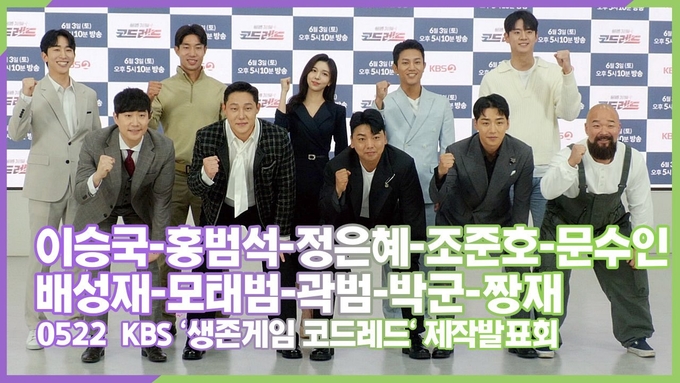 [뉴스인스타 양철수기자] 5월 22일(월) 오전, 서울시 영등포구 여의도 KBS 본관 시청자광장에서 KBS 2TV 새 예능 '생존게임 코드레드' 제작발표회가 열려 진행자 아나운서 배성재, 정은혜, 이승국, 홍범석과 출연자 박군, 모태범, 조준호, 곽범, 짱재, 문수인이 포토타임을 갖고 있다.