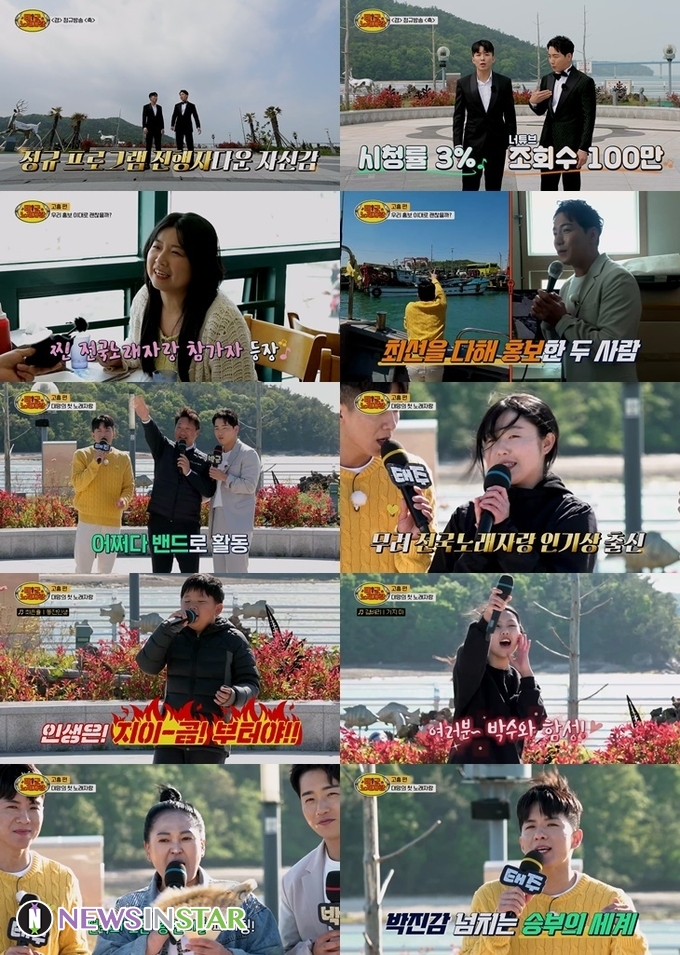 이와 함께 펼쳐진 노래자랑은 토너먼트 즉석 대결로 유일한 심사위원이자 노래방 기계 태진이 형의 점수에 따라 가장 높은 점수가 나오는 참가자가 승리하고 동점이 나오면 재대결이 벌어지는 룰이었다. 첫 번째 참가자는 교육 컨설팅 종사자로 조항조의 ‘고맙소’를 가창했고, 두 번째 참가자로 등장한 핑크바지 여학생은 고흥군 홍보기자단이자 전국노래자랑 인기상 경력으로 관심을 한 몸에 받았다. 특히 금잔디의 ‘사랑껌’을 간드러지게 가창하던 중 아버지까지 무대에 등판, 딸의 백댄서를 자처하며 무대를 장악하는 등 부녀케미가 돋보였다. 이후 등장한 참가자는 평소 진성의 노래를 좋아한다는 초등학교 4학년. 11세 소년은 “98점”이 목표라는 당찬 각오와 함께 진성의 ‘동전인생’을 불렀고, 11년 연륜이 묻어나는 꺾기와 가사 표현력으로 급기야 지나가던 관광객들의 발길을 멈추게 만들며 박수갈채를 받았다.