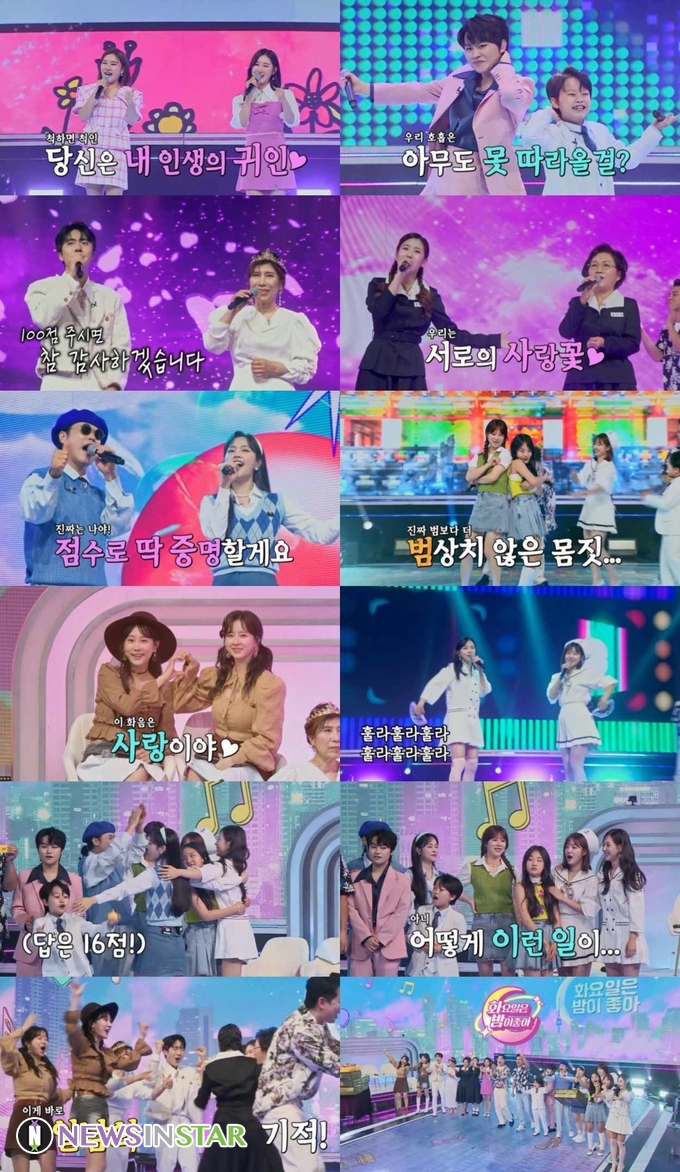 이날 방송은 ‘뽕짝쿵짝 패밀리 특집’으로 송가인·조은서, 황민우·황민호, 임주리·재하, 소명·소유미, 오유진·유일남이 출연해 노래 대결을 펼쳤다. 송가인·조은서, 황민우·황민호, 임주리·재하, 소명·소유미, 오유진·유일남은 ‘가인이어라’, ‘니가 왜 거기서 나와’, ‘탱고의 연인’, ‘유쾌 상쾌 통쾌’, ‘사랑꽃’을 부르며 ‘화밤’의 문을 활짝 열었다. 특히 배우이자 ‘송가인 조카’로 알려진 조은서의 출연이 눈길을 끌었다. 송가인은 조은서에 대해 “딸 같은 존재”라며 남다른 애정을 보였다. 조은서는 송가인이 가장 좋을 때를 묻자 “뭐니 뭐니 해도 머니”라고 솔직한 대답을 내놔 공감을 유발했다. 황민우·황민호 형제는 모든 것을 불 태운 화끈한 댄스 배틀로 ‘화밤’의 분위기를 끌어올렸다.