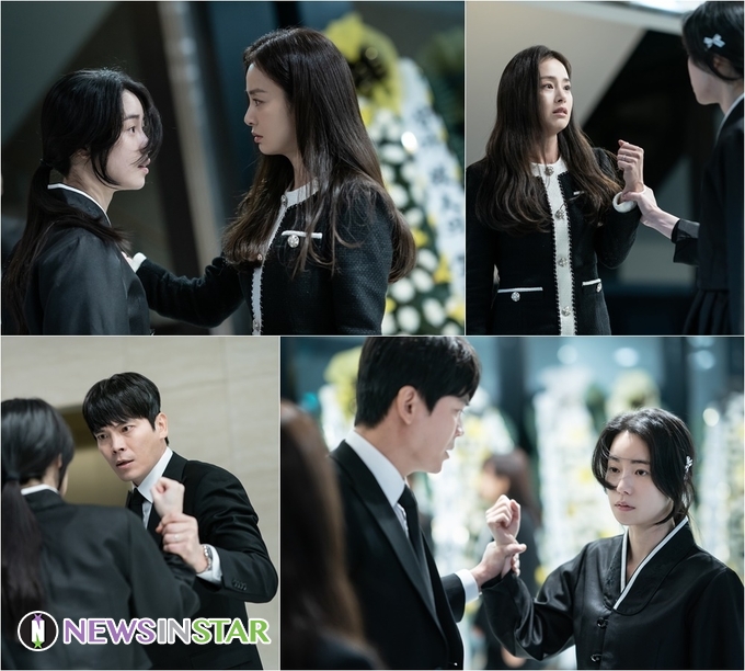 방송 첫 주부터 국내외 시청자들의 뜨거운 호평을 얻으며 2023년 최고의 웰메이드 스릴러로 우뚝 선 지니 TV 오리지널 드라마 ‘마당이 있는 집’(연출 정지현, 허석원/극본 지아니/기획 KT스튜디오지니/제작 스튜디오드래곤, 영화사 도로시, 이하 '마당집') 측이 오늘(26일) 3회 방송을 앞두고, 장례식장 한복판에서 벌어진 문주란(김태희 분)-추상은(임지연 분)-박재호(김성오 분)의 신경전을 현장 스틸로 공개해 이목을 집중시킨다.