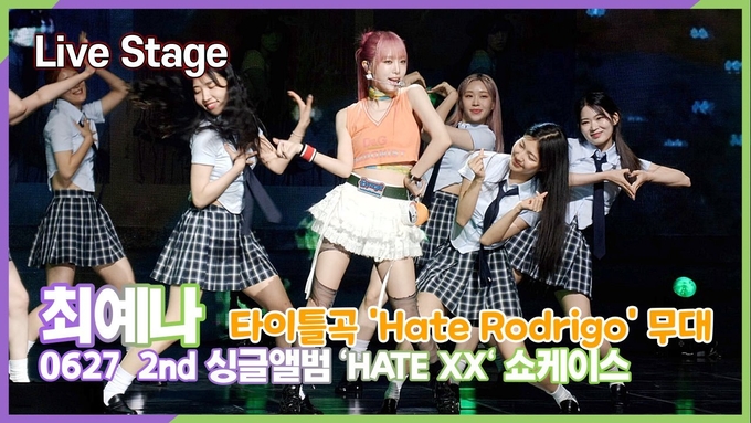 [케이팝인스타 양철수기자] 6월 27일(화) 오후, 서울시 용산구 한남동 블루스퀘어에서 가수 최예나의 두번째 싱글앨범 'HATE XX' 발매 기념 쇼케이스가 열려 타이틀곡 'Hate Rodrigo' 무대를 선보이고 있다.