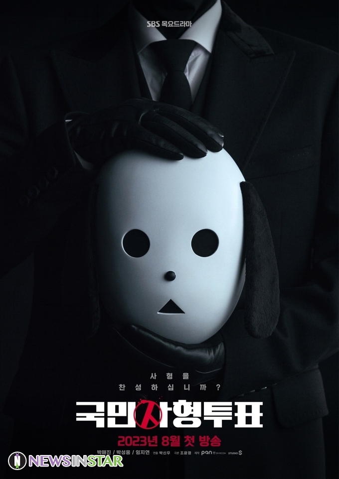 이런 가운데 7월 13일 ‘국민사형투표’가 선사할 신선한 충격을 임팩트 있게 담아낸 티저 포스터가 기습 공개됐다. ‘국민사형투표’ 티저 포스터에는 주연 배우 3인 박해진(김무찬 역), 박성웅(권석주 역), 임지연(주현 역)은 물론 그 어떤 배우의 얼굴도 담겨 있지 않다. 검은 슈트를 입은 누군가가 표정이 없는 개탈을 든 채 서있을 뿐이다. 검은 배경과 대비되는 새하얀 개탈이 시선을 강탈한다.