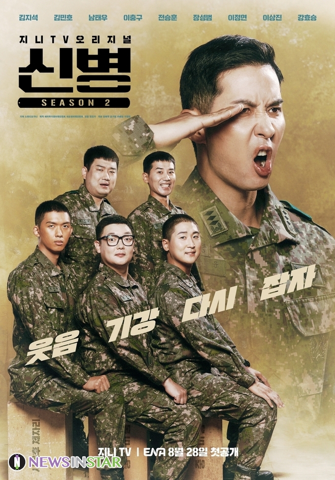 오는 28일(월) 첫 공개되는 지니 TV 오리지널 ‘신병2’(연출 민진기, 극본 장삐쭈·윤기영·허혜원·지정민, 기획 KT스튜디오지니, 제작 A2Z엔터테인트먼트·네오엔터테인먼트)측은 3일, FM 중대장 오승윤(김지석 분)의 카리스마에 군기가 바짝 든 ‘신병즈’ 박민석(김민호 분), 최일구(남태우 분), 김상훈(이충구 분), 임다혜(전승훈 분), 차병호(강효승 분)의 모습이 담긴 티저 포스터를 공개했다. 뼛속까지 ‘찐’ 군인 오승윤이 불러올 화끈한 변화에 이목이 집중된다.