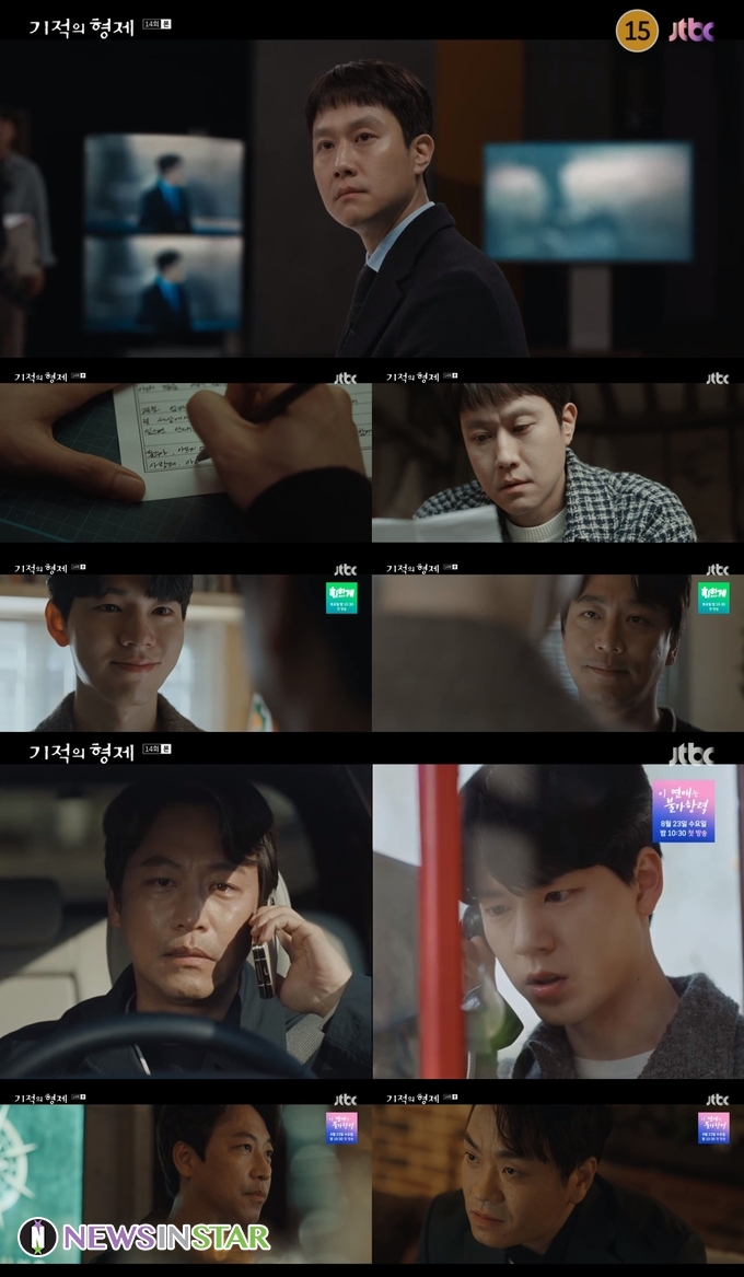 그리고 진실을 밝히려는 또 한 사람, 동주가 뉴스룸에 들어섰다. 비디오테이프를 경찰에 넘기라는 현수의 설득에도 동주는 우선 언론 공개를 결정했다. 태강그룹이 언론과 검찰을 움직이기 전, 속전속결로 모든 국민이 진실을 선명하게 다 알 수 있는 길을 선택한 것이다. 평소 알고 지내던 앵커(류승수)에게 자신이 제시한 조건을 수용하겠다는 답변을 받은 동주는 뉴스에 영상을 공개했다. 이 진실이 과연 어떤 결말을 불러올지, 그리고 자신의 과오까지 밝히기로 결심한 동주가 그 후폭풍을 어떻게 성실하게 감내할지, 종국에 ‘기적의 형제’ 동주와 강산은 해피 엔딩을 맞을 수 있을지, 그 어느 때보다 다음주가 기다려지는 엔딩이었다. ‘기적의 형제’는 매주 수, 목 밤 10시 30분 JTBC에서 방송된다.