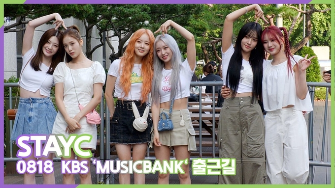 [뉴스인스타 양철수기자] 8월 18일(금) 오후, 서울시 영등포구 여의도 KBS 신관 공개홀에서 진행되는 KBS '뮤직뱅크' 리허설을 위해 그룹 스테이씨(STAYC) 수민, 시은, 아이사, 세은, 윤, 재이가 방송국에 도착해 포즈를 취하고 있다.