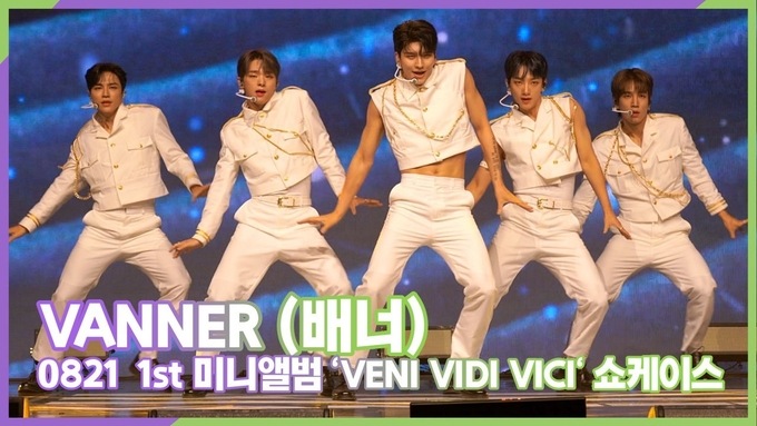 [케이팝인스타 양철수기자] 8월 21일(월) 오후, 서울시 광진구 광장동 예스24라이브홀에서 열린 그룹 '배너(VANNER)'의 첫 번째 미니앨범 '베니 비디 비시(VENI VIDI VICI)' 발매 기념 쇼케이스가 열려 태환, 영광, 곤(GON), 혜성, 성국이 참석해 타이틀곡 '퍼포머(PERFORMER)' 무대를 선보이고 있다.
