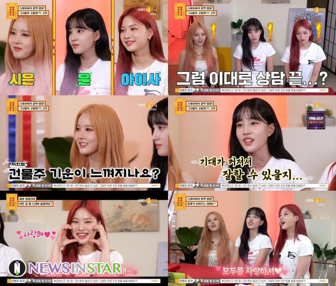 스테이씨(수민, 시은, 아이사, 세은, 윤, 재이)는 지난 21일 방송된 KBS Joy ‘무엇이든 물어보살’에 출연해 고민을 털어놨다. 이날 ‘무엇이든 물어보살’을 찾아온 시은, 윤, 아이사는 “와 신기해” “올라가는 것부터 신비롭다” 등 발랄한 리액션으로 점집에 상큼한 기운을 불어 넣었다.