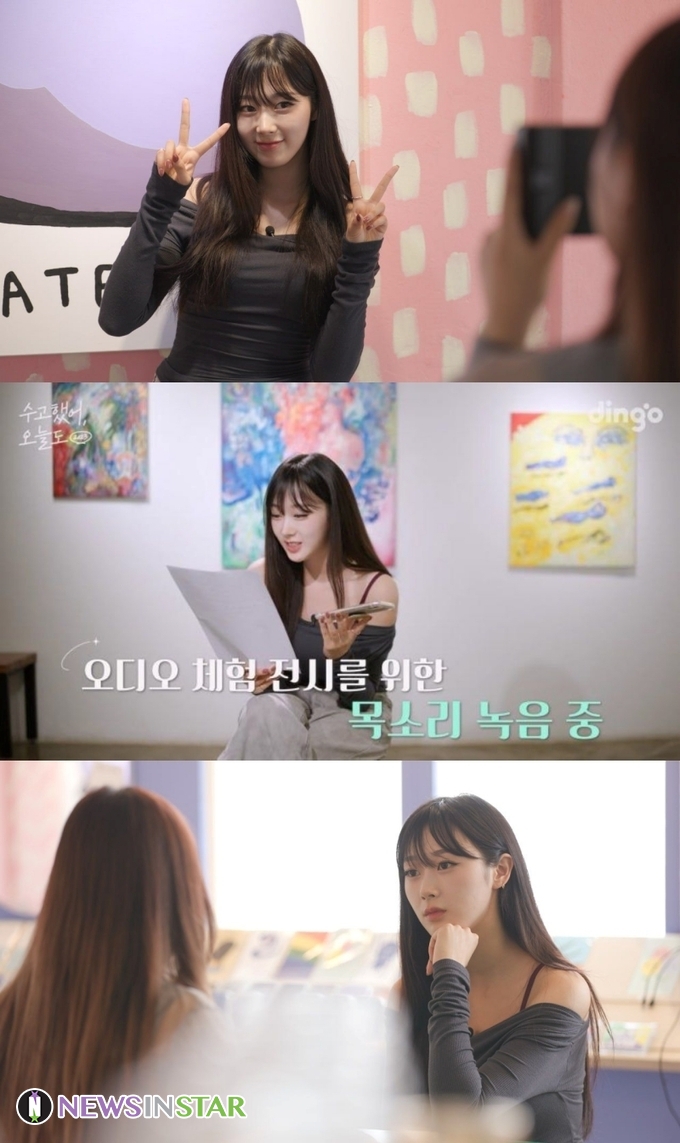 디지털 미디어 채널 딩고(dingo)는 지난 25일 오후 6시 딩고 스토리 공식 유튜브 채널을 통해 지젤과 함께한 '수고했어 오늘도 2023' 19화를 공개했다. '수고했어 오늘도'는 2016년부터 제작된 딩고의 킬러 콘텐츠로, 꿈을 이룬 스타가 꿈을 향해 달려가는 팬의 일상을 찾아가 응원과 희망을 전하는 리얼리티 프로그램이다. 이번 영상에서 지젤은 대학교를 휴학하고 아르바이트를 하며 꿈을 찾기 위해 노력하는 대한민국의 청춘이자 자신의 열렬한 팬인 유진 씨를 만났다. 미술 관람이 취미인 유진 씨를 위해 어느 전시회의 오디오 가이드를 녹음한 것에 이어 깜짝 등장한 지젤은 "서울까지 오느라 너무 고생했다"라며 반가운 인사를 건넸다.