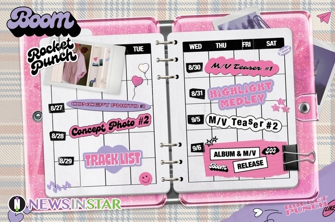 소속사 울림엔터테인먼트는 지난 26일 오후 6시 공식 SNS를 통해 로켓펀치의 세 번째 싱글 '붐(BOOM)' 컴백 스케줄러를 공개했다. 공개된 이미지는 사랑스러운 체크 패턴의 유니크한 배경 위로 핑크색 다이어리가 펼쳐져 있다. 여기에 '붐'의 티징 일정이 다양한 글자와 스티커로 아기자기하게 꾸며져 있는 키치한 디자인이 시선을 사로잡았다.
