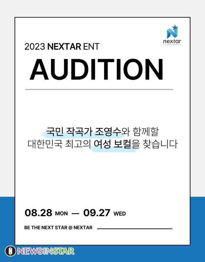 넥스타엔터테인먼트는 28일부터 오는 9월 27일까지 오디션을 진행한다. 내국인만 지원 가능한 이번 오디션은 보컬 부문만 신청 가능하며 1999년생부터 2007년생 여자라면 지원할 수 있다.