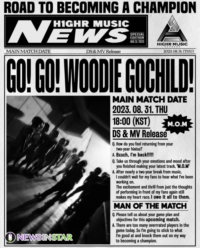 먼저 거칠고 색다른 분위기를 자아내는 우디 고차일드의 모습을 담은 티저 이미지가 공개되었다. 전체 화면을 뒤덮은 ‘B**CH I’M BACK U FEEL ME?’, ‘I’M THE MAN OF THE MATCH’ 등 문구도 시선을 끌어당긴다.