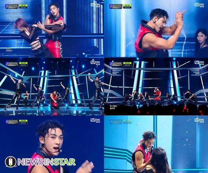 드디어 본 무대에 오른 백호는 등장하자마자 단숨에 시선을 사로잡았다. 레드 포인트의 스포티룩 착장으로 비주얼부터 섹시 포텐셜을 제대로 터트린 백호는 전주가 시작되자 고농도의 섹시 아우라를 온몸으로 내뿜었다. 독보적인 섹시 콘셉트로 ‘엠카운트다운’ 무대를 찢은 백호다.