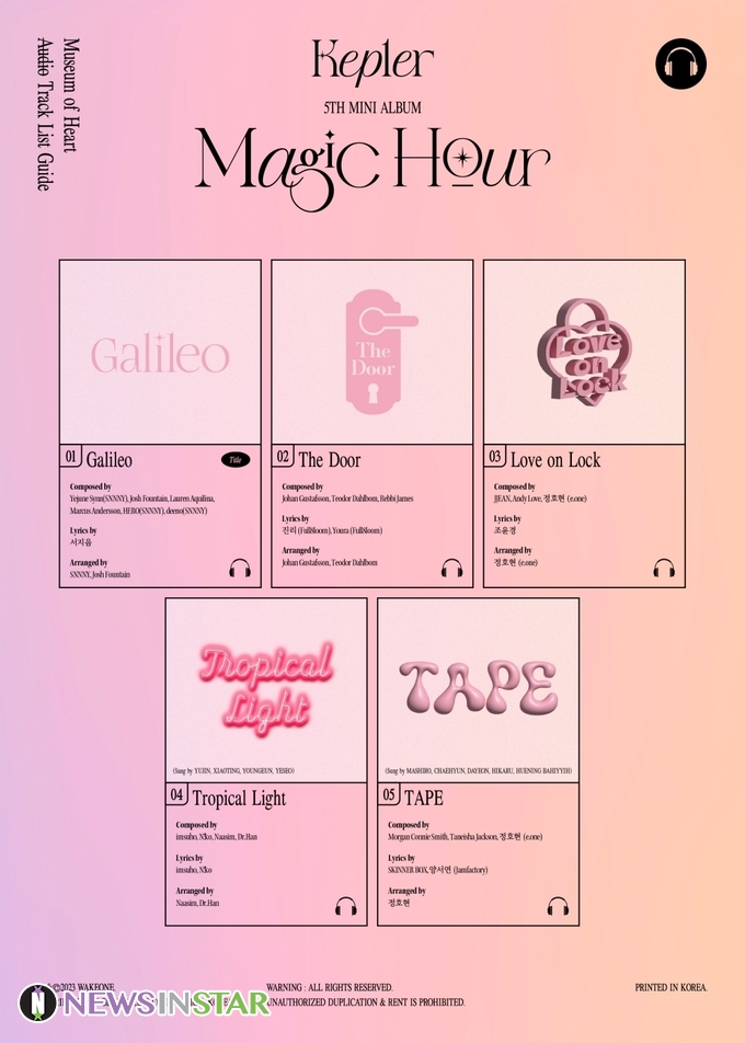 케플러(최유진, 샤오팅, 마시로, 김채현, 김다연, 히카루, 휴닝바히에, 서영은, 강예서)는 4일 0시 공식 SNS를 통해 오는 25일 발매될 미니 5집 'Magic Hour (매직 아워)'의 트랙리스트를 게재했다.