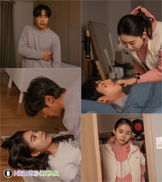 권숙은 상처로 얼룩진 태영의 얼굴에 깜짝 놀라고, 이내 거실 바닥에 누워 초밀착 눈맞춤을 나누고 있는 두 사람 사이에 미묘한 분위기가 흘러 보는 이들의 심박수를 높인다.