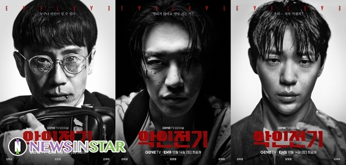10월 14일 첫 공개되는 지니 TV 오리지널 드라마 ‘악인전기’(극본 서희, 이승훈/연출 김정민, 김성민/기획 KT스튜디오지니/제작 필름몬스터)가 흑백의 대비를 이룬 신하균, 김영광, 신재하의 캐릭터 포스터를 공개했다. 포스터에는 선과 악, 그 경계에 선 3인의 메시지가 담겨 있어 이목을 집중시킨다.